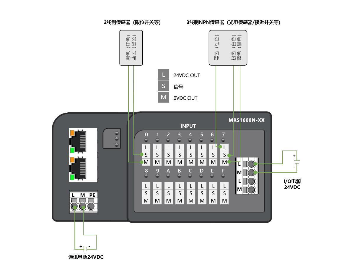 面板式快接線分布式I/O,CC-Link IE FiledBasic通訊,2xRJ45,可級(jí)聯(lián);數(shù)字量16入 NPN,24VDC,歐式彈簧端子;導(dǎo)軌安裝&打孔安裝(下單時(shí)需備注)